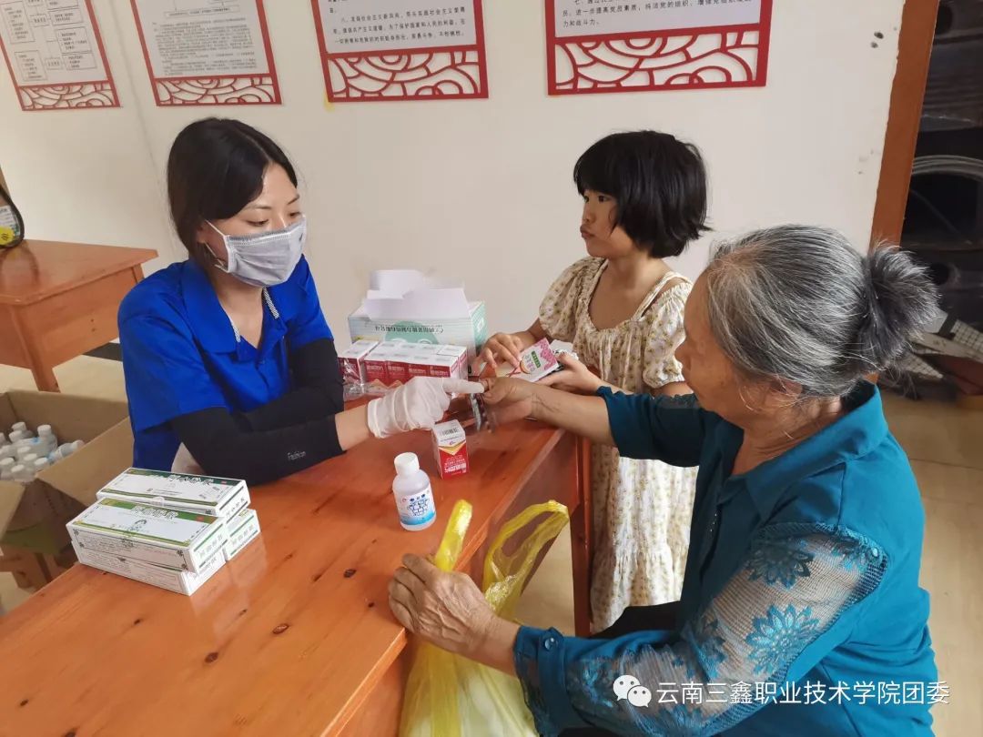 醫學專業同學為村民耐心講解藥品的使用方法、用量、功效以及注意事項。