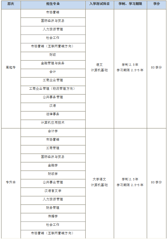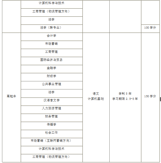 英語類 | 大學英語(A)、計算機應用基礎 | 專科起點本科教育入學考試(自主考試或成人高考)科目中沒有“大學語文”或“高等數學”成績的,按不同專業須加試統考科目“大學語文(B)”或“高等數學(B)”, 加試科目的選擇同高中起點本科學生的專業分類。 |